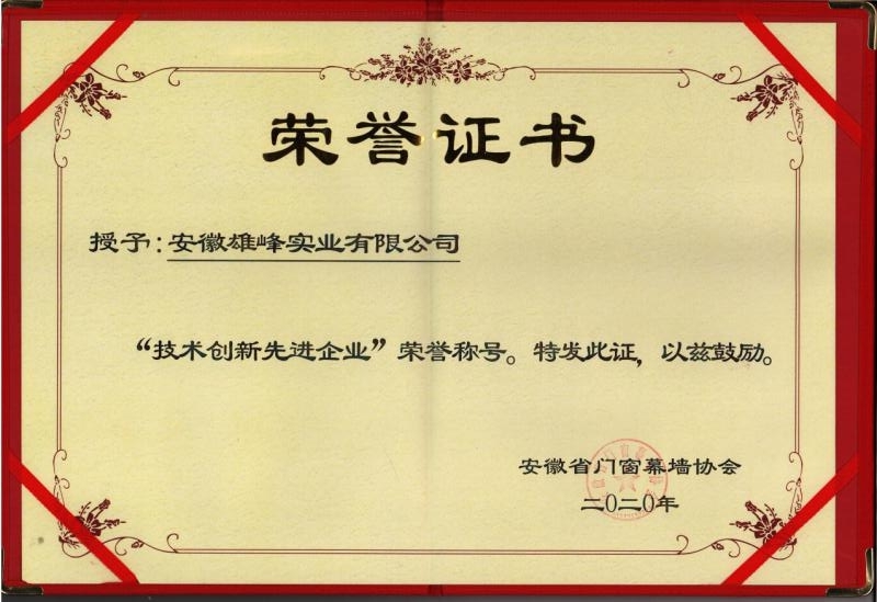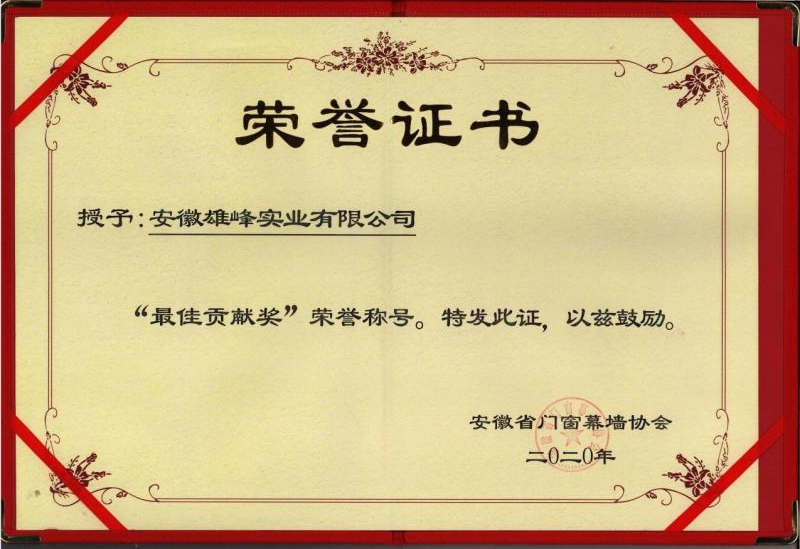 2020年10月,我公司被安徽省門(mén)窗幕墻協(xié)會(huì)授予“技術(shù)創(chuàng)新先進(jìn)企業(yè)”“最佳貢獻(xiàn)獎(jiǎng)”榮譽(yù)稱號(hào)