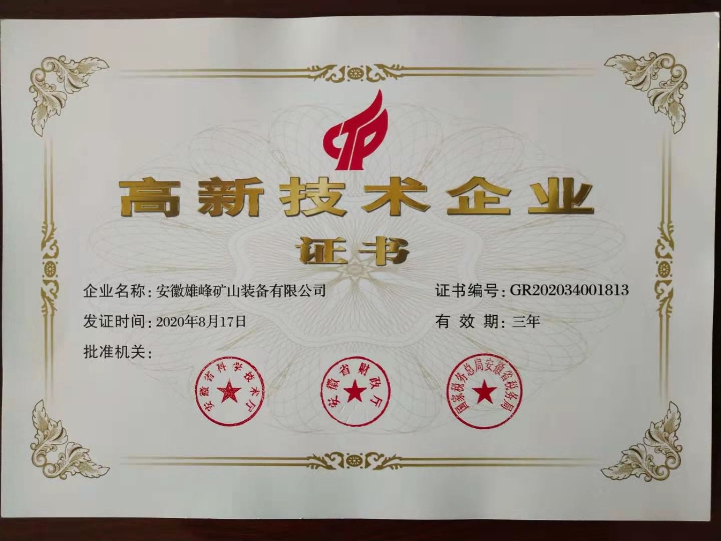 根據(jù)國(guó)家《高新技術(shù)企業(yè)認(rèn)定管理辦法》和《高新技術(shù)企業(yè)認(rèn)定管理工作指引》的相關(guān)規(guī)定,安徽雄峰礦山裝備有限公司被認(rèn)定為國(guó)家級(jí)高新技術(shù)企業(yè)。近日,公司也已收到了由安徽省科學(xué)技術(shù)廳、安徽省財(cái)政廳、國(guó)家稅務(wù)總局安徽省稅務(wù)局聯(lián)合頒發(fā)的“高新技術(shù)企業(yè)”認(rèn)定證書,由此正式邁入國(guó)家高新技術(shù)企業(yè)行列。